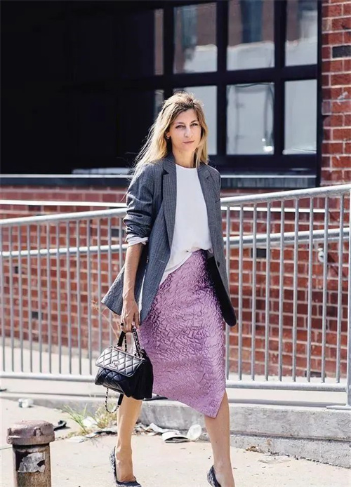灰色搭配紫色,很適合作為成熟的時(shí)髦的職場(chǎng)裝: