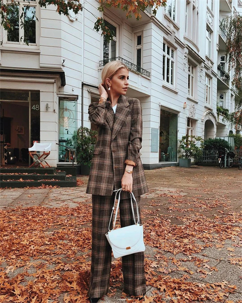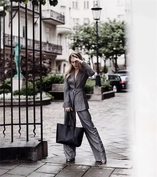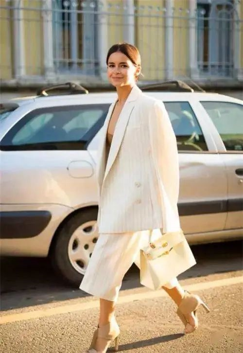 即便是成套的西裝,也最好不要選上衣長度過臀的,視覺上就五五分了,你就算在褲腿里藏一雙高跟鞋,也依舊掩飾不了比例的失調。
