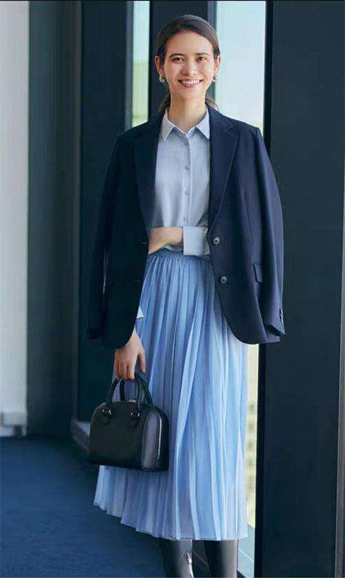 深藍(lán)、淺藍(lán)組成的同色系藍(lán)色搭配,打造雅致得體的商務(wù)形象,這一組搭配很適合淺冷、冷柔、柔冷 型人穿著。